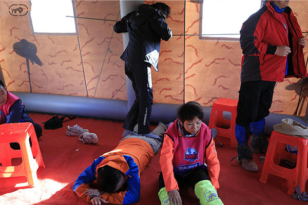傍晚達(dá)到營(yíng)地,每個(gè)人都風(fēng)塵仆仆,脫下襪子腳腫了一圈,有的襪子被血水模糊了,撕下來(lái)淚水隱忍而出。看著周邊的同伴,原以為她自己情況是最慘的,但不知團(tuán)隊(duì)里有人原本就膝蓋痛,有的人發(fā)燒,有的人也來(lái)例假,有的人近240斤仍不懈前行,有的人比自己還要高齡也不放棄。