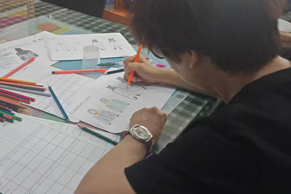 盡管困難重重,我們也要想進一切辦法做到,不僅要做好,而且要做到最好!我們的總經理自己也搖身一變設計師——畫稿,可以看到以下的圖片,認真、負責的態度,用心的為客戶所思,一筆一筆的畫好,一點點的涂好顏色;還有一個紙樣哥哥也在幫忙畫,他們兩個人在一兩天的時間內要畫好接近10個款衣服和褲子,雖然我們的時間不多,但是睿牛的小伙伴們也是很努力的去做,努力過就不曾后悔。