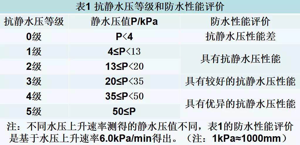 數(shù)據(jù)來自:GB/T4744-2013《紡織品 防水性能的檢測和評價 靜水壓法》