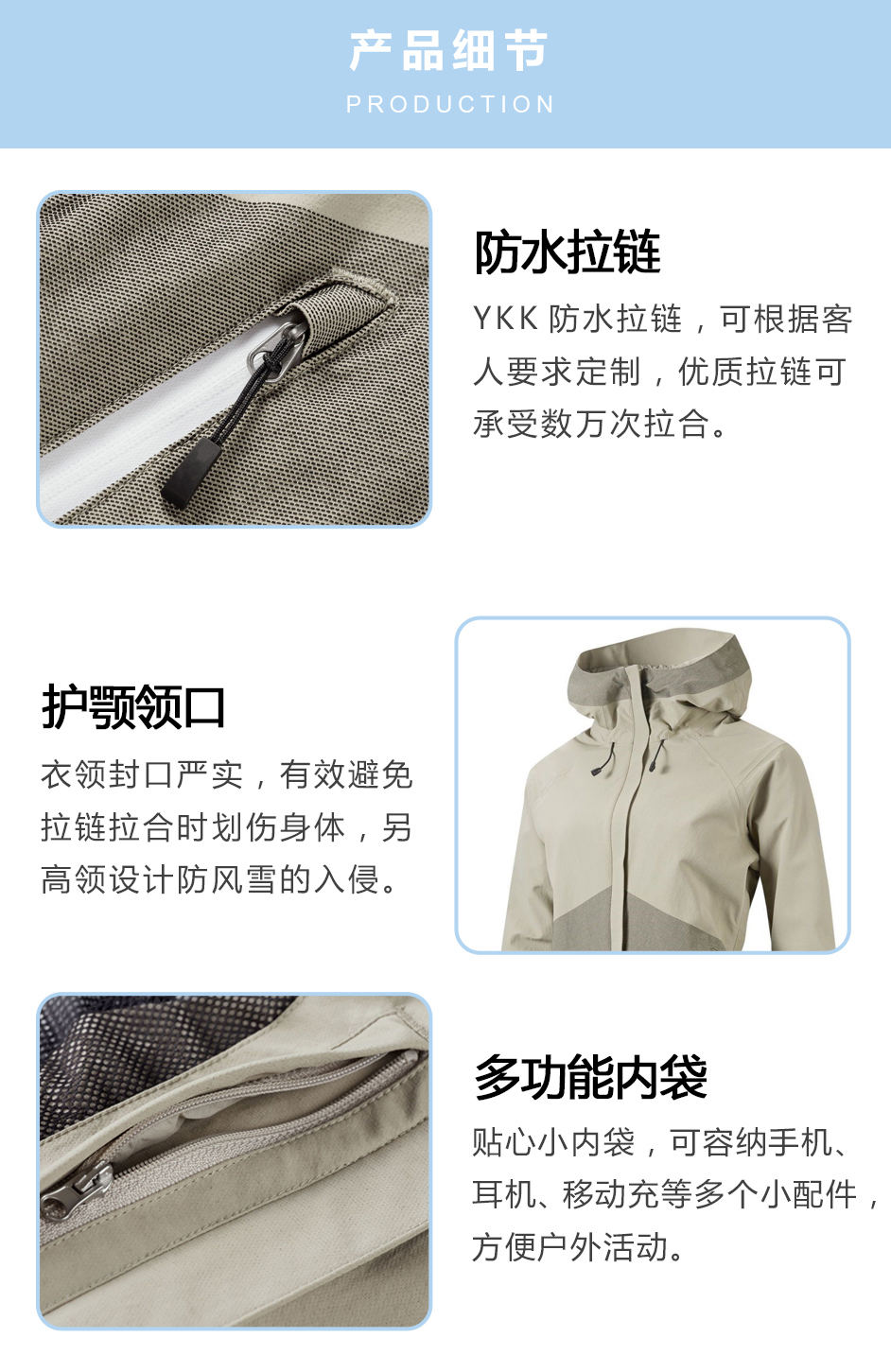 • 防水拉鏈:YKK防水拉鏈,可根據客人要求定制,優質拉鏈可承受數萬次拉合。