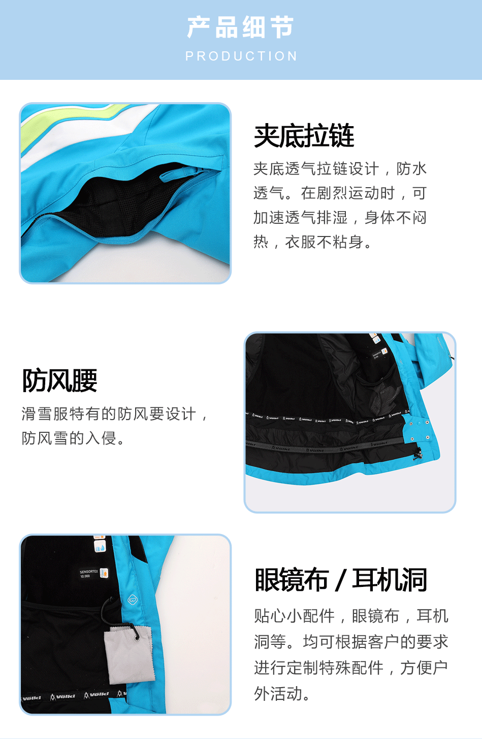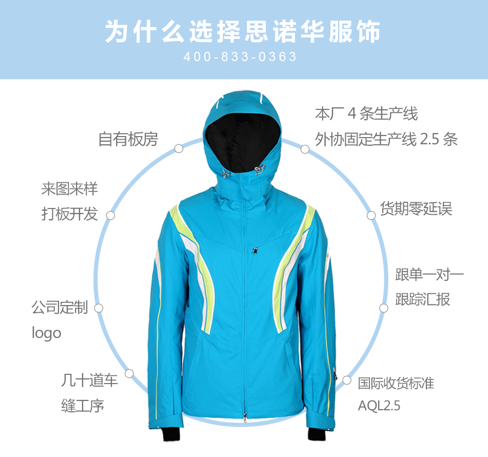 防水拉鏈采用無縫壓膠防水拉鏈激光熱封工藝貼合,面料采用進口防水透氣涂層膜,使防水透氣膜與面料完美結合??筛鶕蛻粜枨?a href="http://m.tj-jhz.com/oem/" target="_self">生產加工沖鋒衣。
