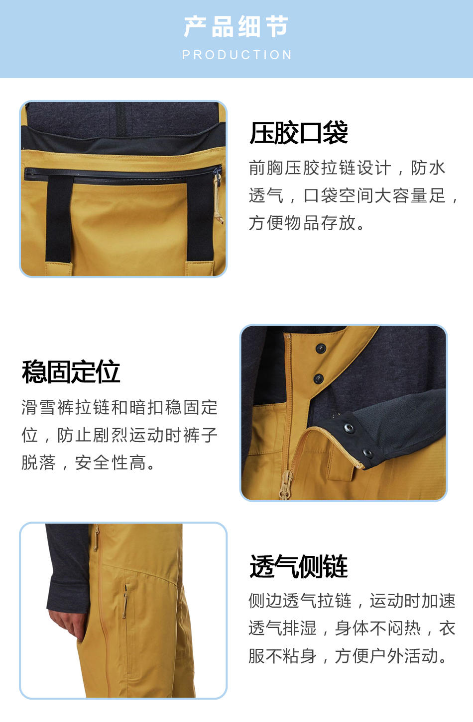 • 穩(wěn)固定位滑雪褲加工的拉鏈和暗扣穩(wěn)固定位,防止劇烈運動時褲子脫落,安全性高。
