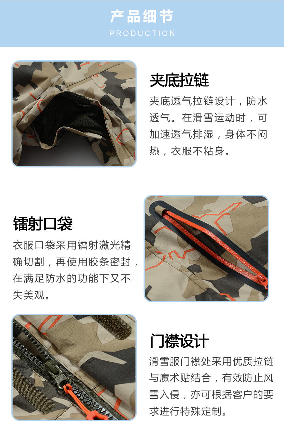 • 門襟設計:滑雪服門襟處采用優質拉鏈與魔術貼結合,有效防止風雪入侵,亦可根據客戶的要求進行特殊保暖滑雪服加工。